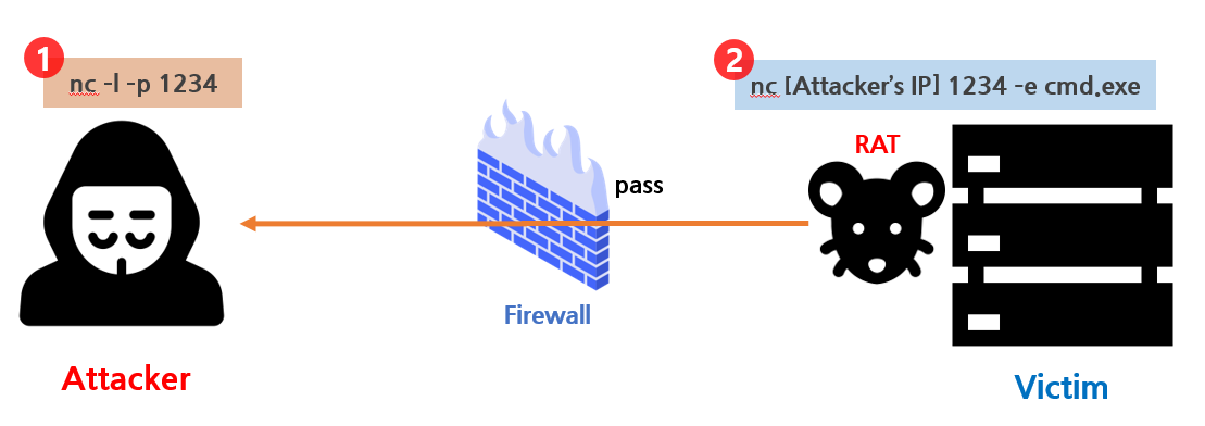 방화벽의 특성을 이용해 백도어를 외부에서 접근하는 것이 아닌 Attacker가 서버가 되어 Victim에 심어둔 RAT가 Attacker로 접속하게 만든다.