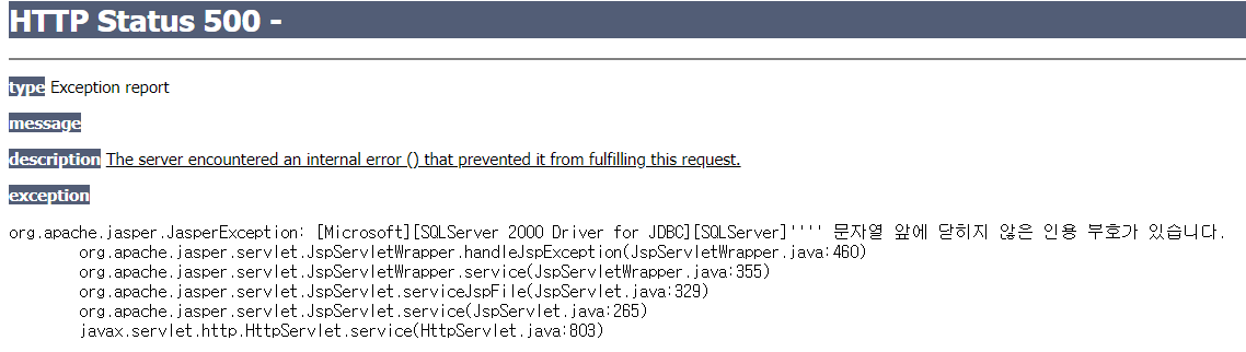 위는 SQL문에 오류가 있을경우 보이는 오류 페이지이다. 개발자 입장에서는 오류의 원인을 파악할 수 있어 용이할 수 있으나 공격자의 경우 DB에 대한 여러 가지 정보를 얻을 수 있기 때문에 위험할 수 있다.