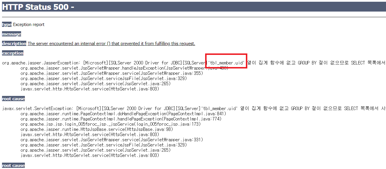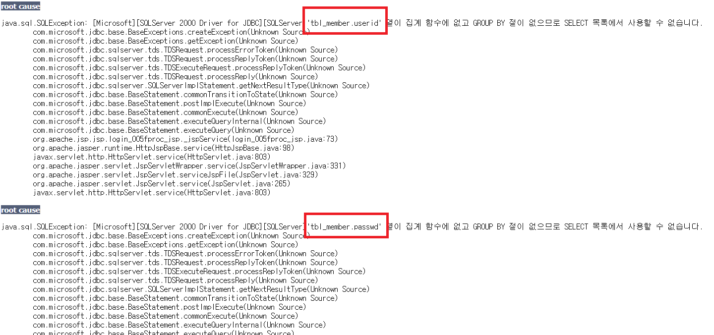 우리는 이 오류 메시지를 통해서 웹 서버가 MSSQL을 사용한다는 것과 로그인 테이블이 "tbl_member"이며 컬럼이 "uid", "userid", "passwd" 가 있다는 정보를 얻을 수 있다. 이 오류 페이지는 아래로 더 많은 정보가 있으며 모든 컬럼 정보가 나와있다.