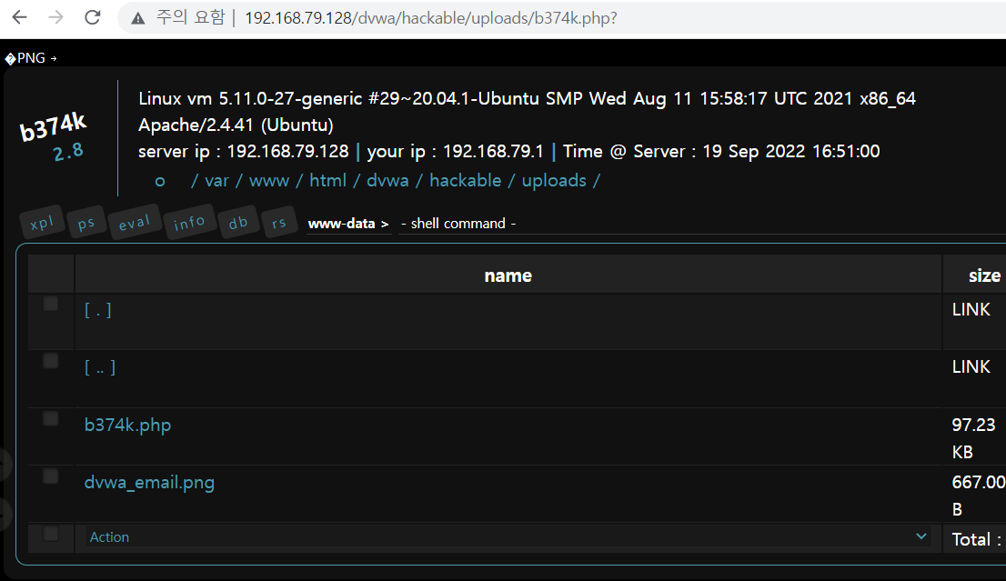 우리는 파일의 시그니처를 수정하여 파일 업로드 필터링을 우회하였고 성공적으로 웹 쉘을 업로드하였다.