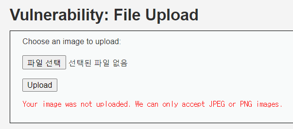 무작정 웹쉘파일을 올리면 php 파일이기 때문에 jpeg나 png 파일이 아니라서 업로드되지 않았다는 메시지가 나온다.