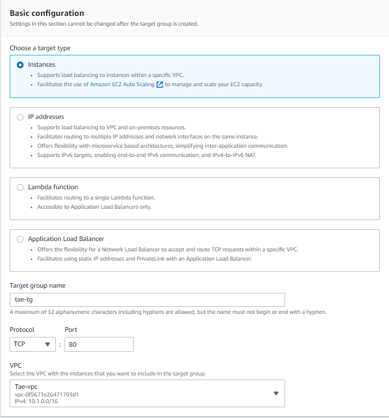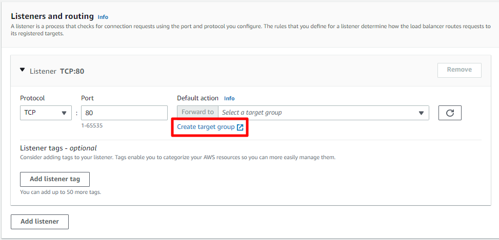 로드밸런싱을 이용할 타겟 그룹을 설정한다. 현재 생성되지 않았으므로 Create target group 버튼을 눌러 생성을 진행한다.