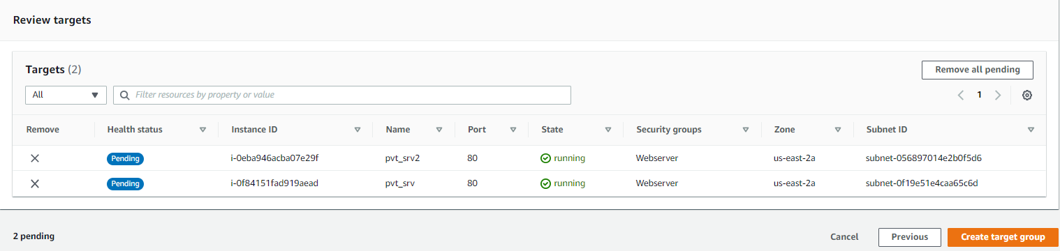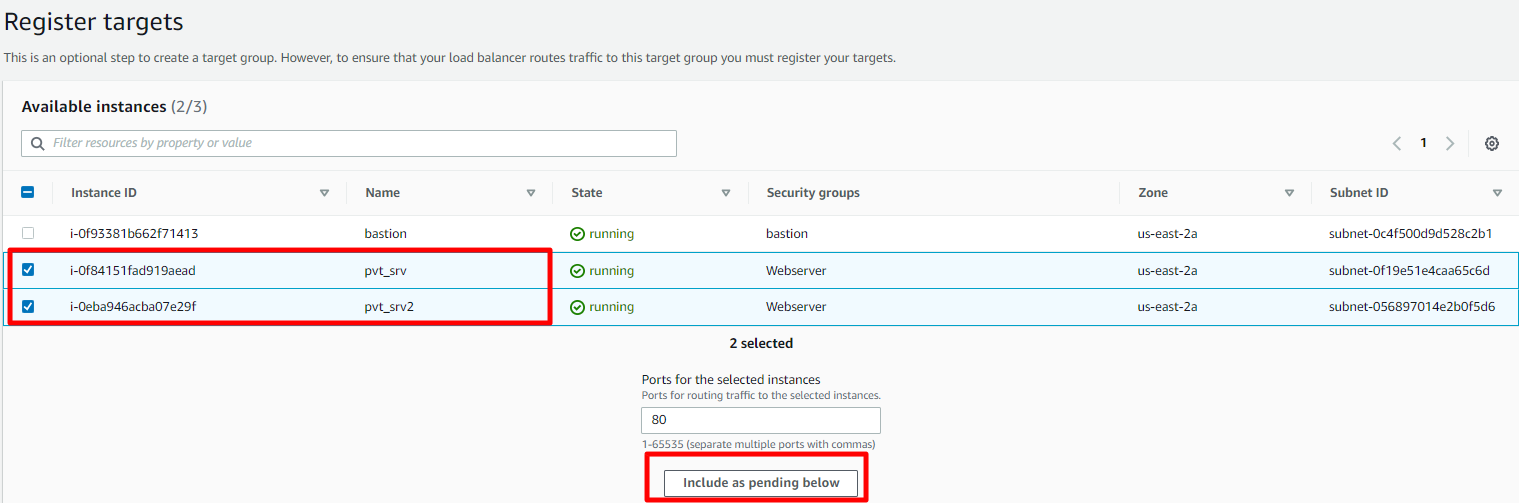 생성한 두 개의 프라이빗 웹 서버를 선택 후 Include as Pending below 버튼을 누른다.