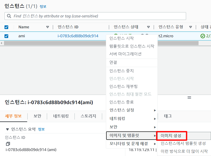 생성한 EC2를 오른쪽 클릭하여 다음과 같이 이미지 생성을 눌러준다. 생성 시 이름 설정 후 기본값으로 진행한다.