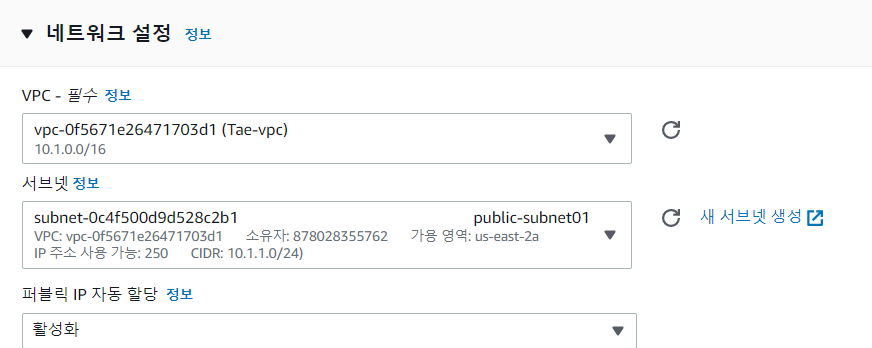 자신의 VPC를 고르면 가용 영역을 선택할 수 있다.