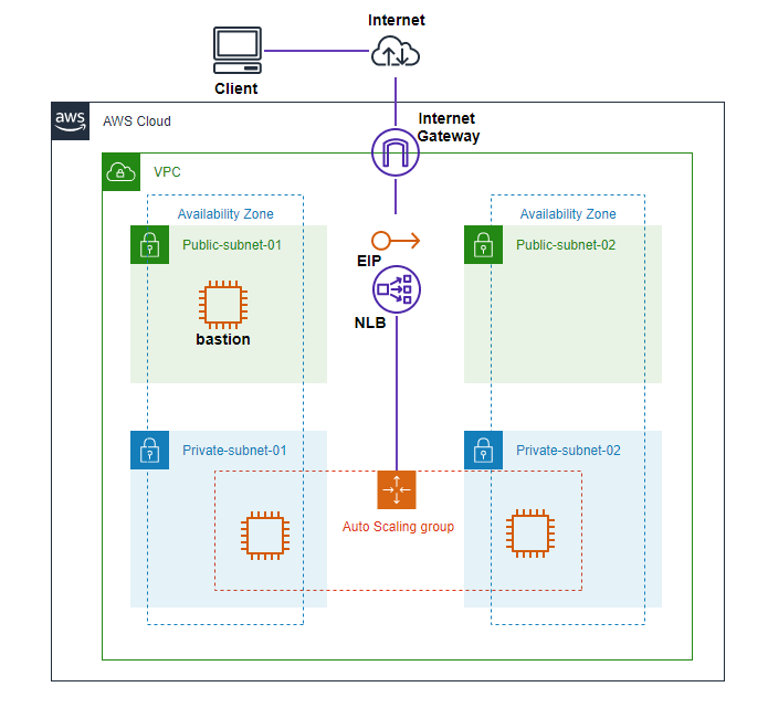 사용되는 기능은 VPC, EC2, NLB를 이용하며 기초적인 생성 방법에 대해서는 다루지 않기 때문에 이전 글을 참고한다.