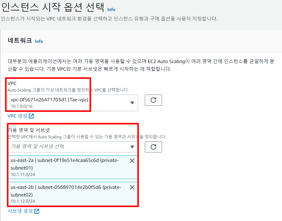 올바른 VPC를 선택한 후 private subnet 두 개를 선택하여 프라이빗에 배치하고 가용성을 높여준다.