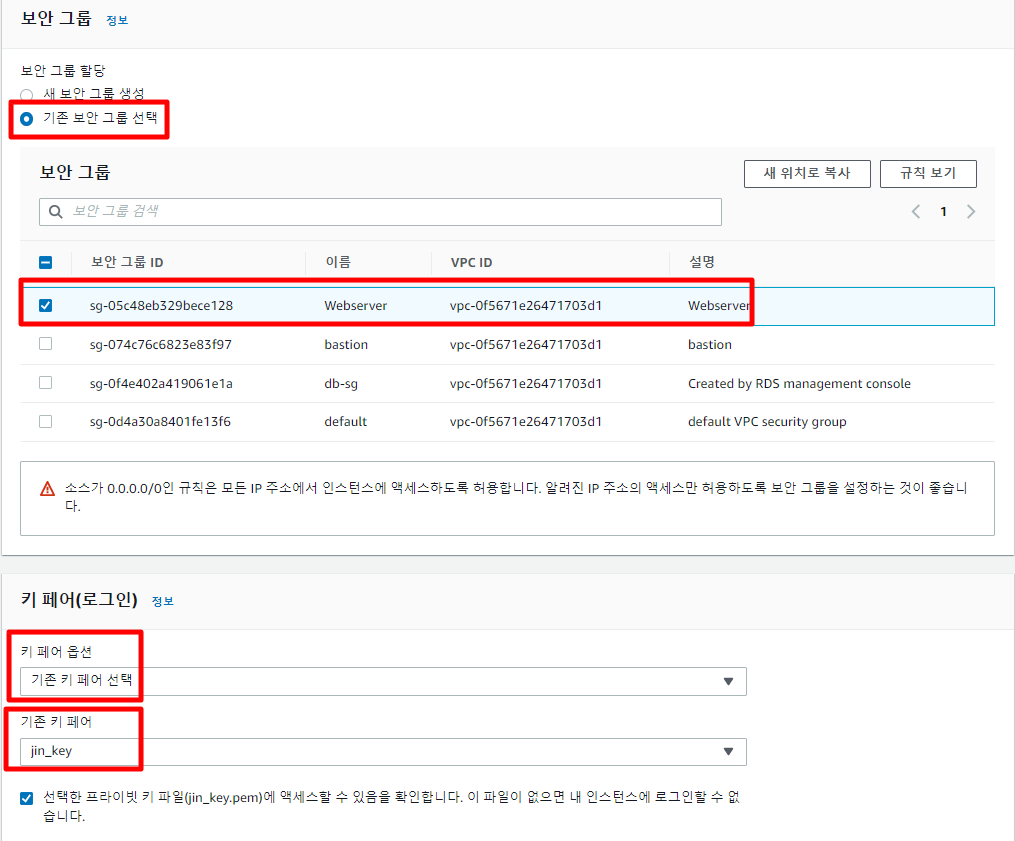 이전에 사용했던 웹서버 보안 그룹을 이용한다.