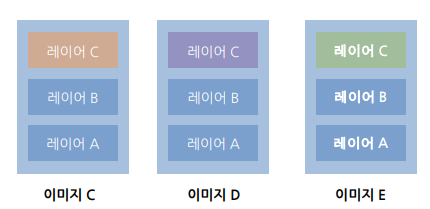 예 2) 이미지 C, D, E를 차례로 내려받을 때 이미지 C에서 설치된 레이어 A, B는 이미지 D, E에서 중복되므로 이미지 D, E를 설치할 때는 중복되지 않는 레이어 C만 설치하게 된다.