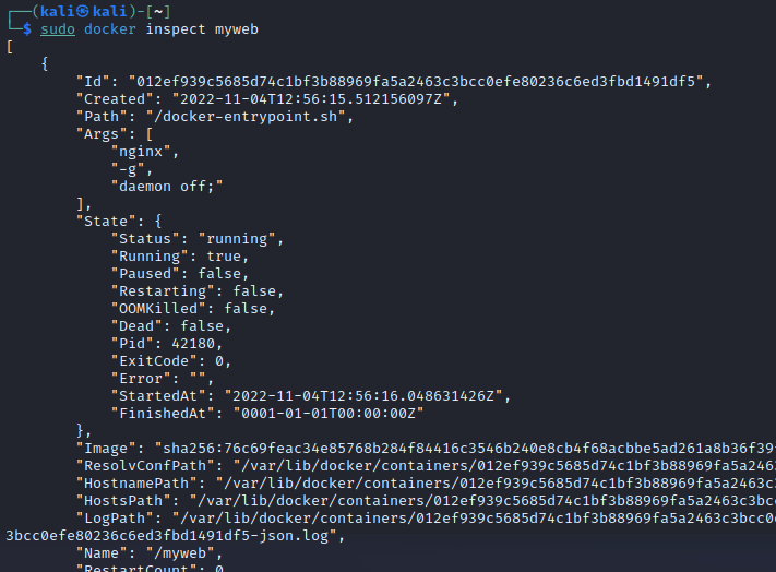 # 도커 요소(컨테이너, 네트워크 등)의 상세정보를 확인