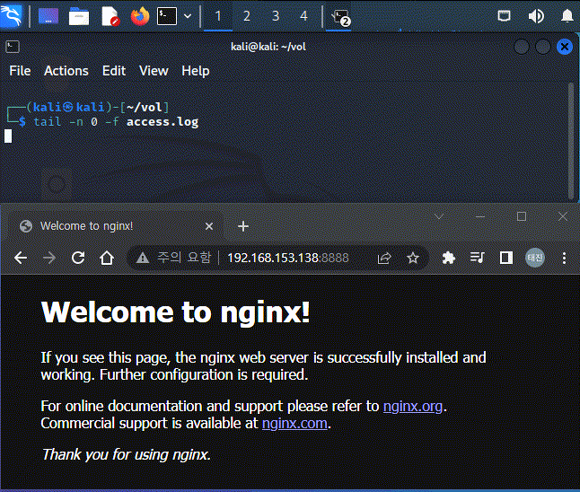 잘 동작하는지 nginx 웹 서버에 직접 접근하여 로그를 확인한다.