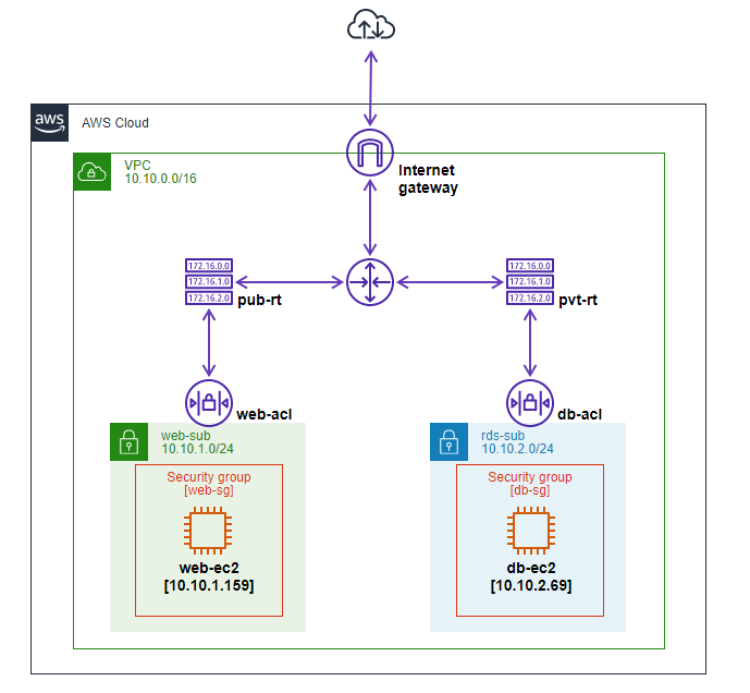 전체적인 흐름으로는 인터넷을 통해 웹서버에 접근하며 웹 서버에서만 db-ec2로 접근할 수 있는 구조이다.
