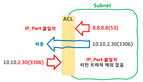 요청한 트래픽을 저장하지 않는 Stateless 속성이므로 리턴 트래픽을 허용하지 않는다.