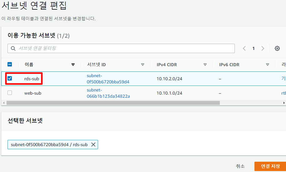 설정한 라우팅 테이블을 사용할 서브넷을 선택한다.