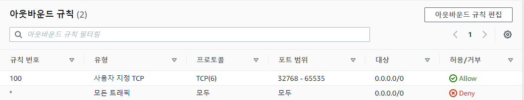 두번째 규칙은 인바운드 요청에 대한 aws의 응답 포트(32768-65535)의 아웃 바운드를 허용한다.