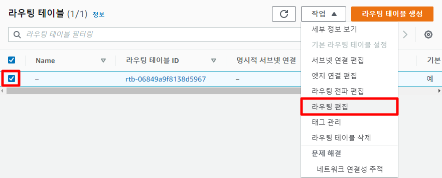 [VPC - 라우팅 테이블]로 진입해 기본적으로 생성된 라우팅 테이블을 클릭하고 라우팅 편집을 들어간다.