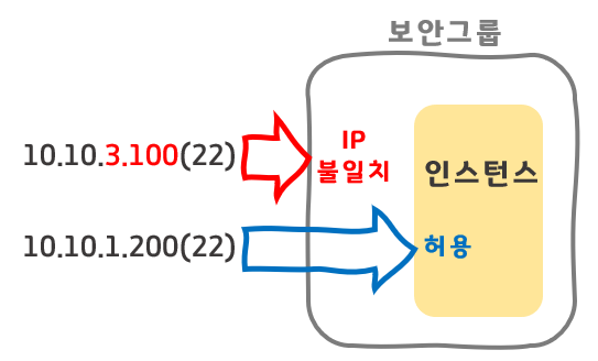 인바운드 규칙에서 포트 범위는 허용되었으나 IP 대역이 "10.10.1.x"가 아니므로 접근이 거부된다.