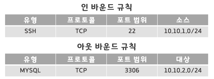 서브넷 주소 : web-sub - [10.10.1.0/24], db-sub - [10.10.2.0/24]