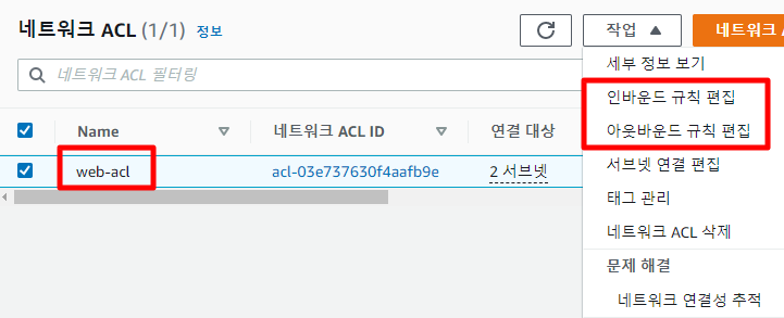 AWS 콘솔에서 [VPC - 보안 - 네트워크 ACL]에서 작업이 가능하다.