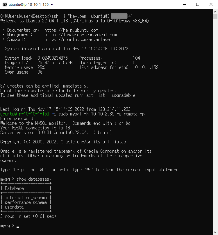 퍼블릭 IP를 통한 웹서버 접근과 ssh 통신, mysql 모두 정상적으로 동작한다.