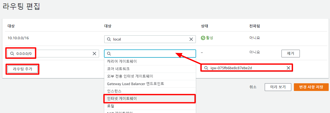 대상은 0.0.0.0/0으로 설정해 모든 주소로 설정하고 인터넷 게이트웨이를 지정한다.