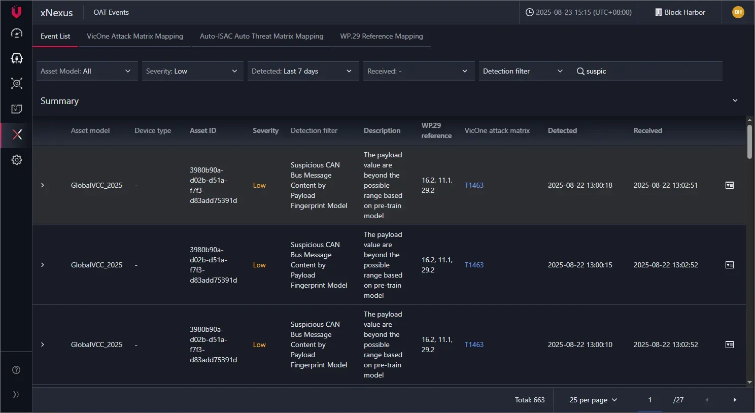 - VicOne xNexus 페이지의 OAT Event에서 Suspicious CAN Bus Message Content by payload Fingerprint Model으로 된 데이터 확인