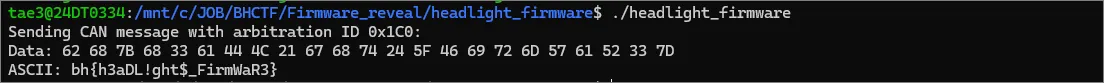 4. elf 형식의 headlight_firmware 파일이 추출되며 리눅스에서 실행 시 Flag가 출력됨