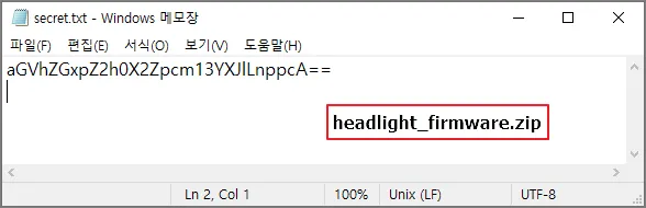 • 추출된 파일들 중 secret.txt 파일이 있고 내용으로는 base64값이 있었습니다. 해당 내용을 base64 decode하면 headlight_firmware.zip 문자열이 됩니다.