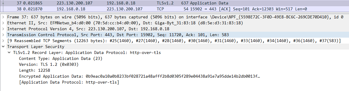 패킷 내부의 데이터가 TLSv1.2라는 프로토콜로 암호화되어 내용은 알 수 없고 암호화에 대한 내용만 담겨 있다.