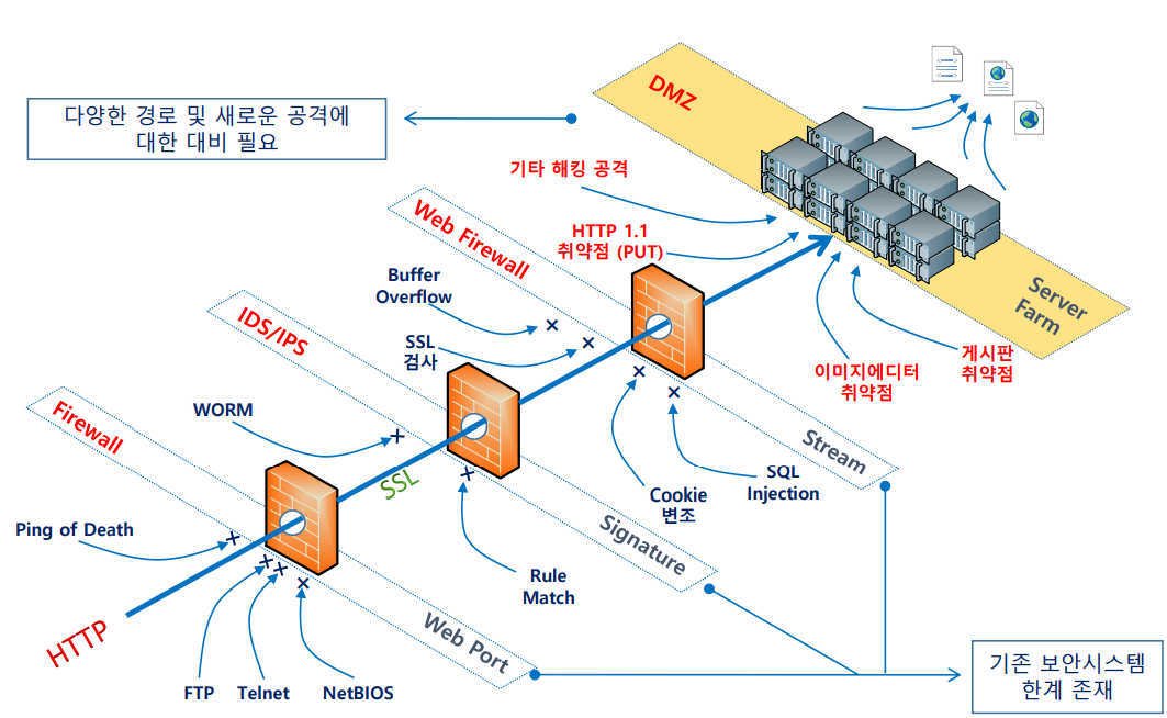 웹 방화벽 : 여러 웹 취약점들을 막으며 난독화된 웹쉘도 막을 수는 있지만 완벽하지는 않기 때문에 침투 가능성이 존재한다.
